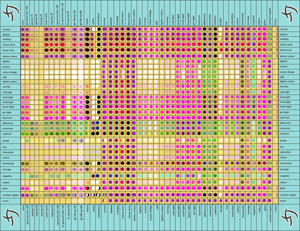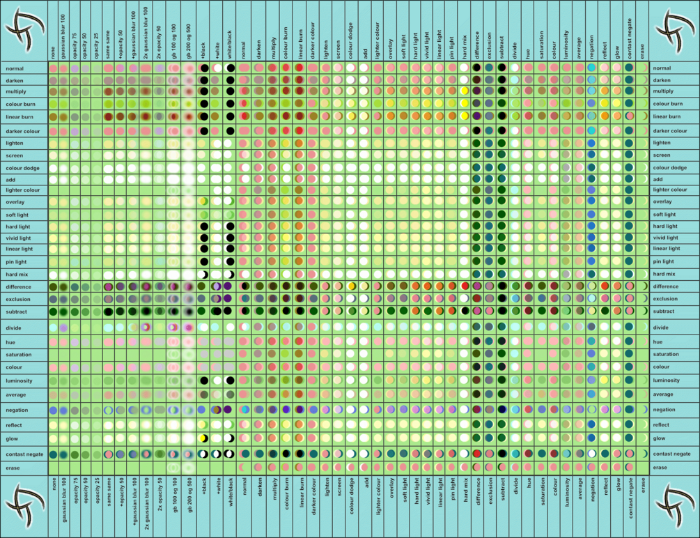 I hope this template will help you get used to blend modes and save a lot of your time. You can combine colours and learn how they behave, all on one page, instead off creating each individually.